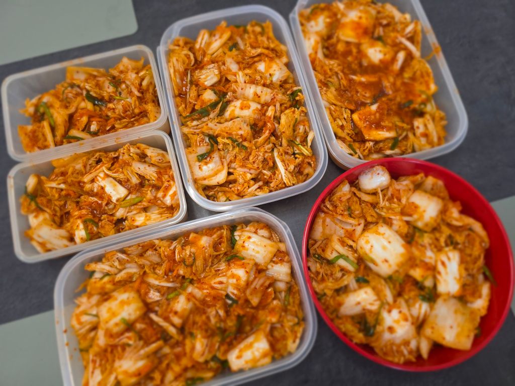 Kimchi-making is a rhythm. Once you get into it, it feels oddly satisfying. There’s a quiet pride in it too. It’s not just about mixing ingredients and letting them ferment. It’s more personal than that. Every time I make it, it feels a little different. I adjust the balance between spicy and salty, try new twists with the seasoning, and hope that it turns out well. There’s something really grounding about working with your hands like that—slicing, mixing, massaging the cabbage leaves until every layer is covered in the fiery red paste.